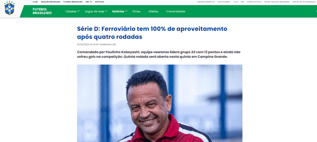 “Com 12 pontos em quatro jogos, o Ferroviário-CE faz grande campanha na Série D – é o único time com 100% de aproveitamento na competição. Parte do sucesso da equipe se deve ao trabalho do treinador Paulinho Kobayashi, que passou pelo clube no início do ano passado e faz questão de dividir os elogios com sua comissão técnica e atletas“, diz o 1º parágrafo da matéria.