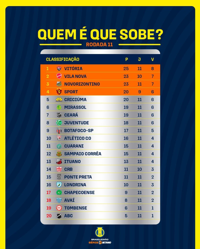 Os outros 3 do G4, permanecem os mesmos. Vitória (que ganhou da Tombense, por 2×1, fora de casa), Vila Nova (bateu a Chapecoense 1×0 também como visitante) e o Novorizontino (derrotou o Guarani por 1×0 em casa).