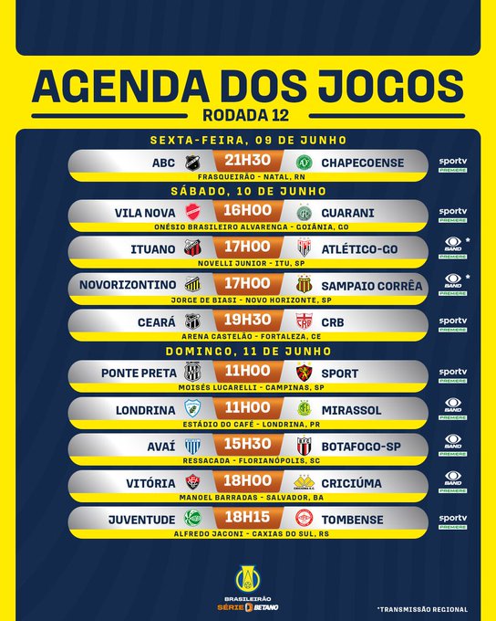 Confira abaixo os jogos da 12ª Rodada, que já começa, hoje, sexta-feira e termina no domingo. Já, no sábado o Ceará recebe o CRB, no Castelão, às 19h30, com transmissão do Sportv e Premiere. Em seguida, veja a classificação atualizada.