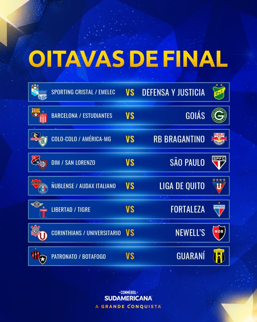 A Conmebol sorteou hoje, quinta-feira, 5, os duelos das oitavas de final da Copa Sul-Americana. O Fortaleza vai enfrentar o vencedor do Play-Off entre Libertad (do Paraguai) e Tigre (da Argentina).