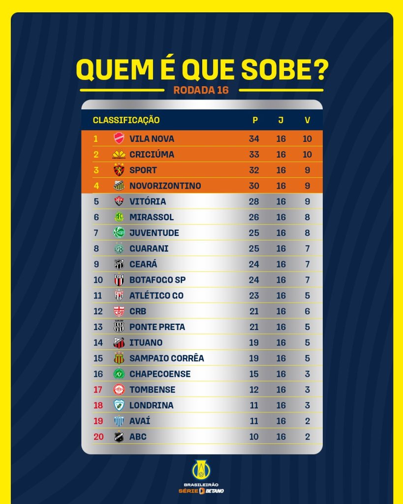 Aliás, o G4 manteve os 4 times, mas com o Vila Nova assumindo a 1º colocação, após bater o Vitória, por 1×0, em Goiânia. E o Sport caindo para o 3º lugar, depois de só empatar em casa por 0x0 contra o Mirassol. E olhe que os pernambucanos perderam no meio de semana para o CRB, por 2×0, e assim já não têm nenhum jogo atrasado.