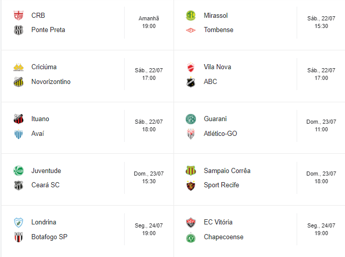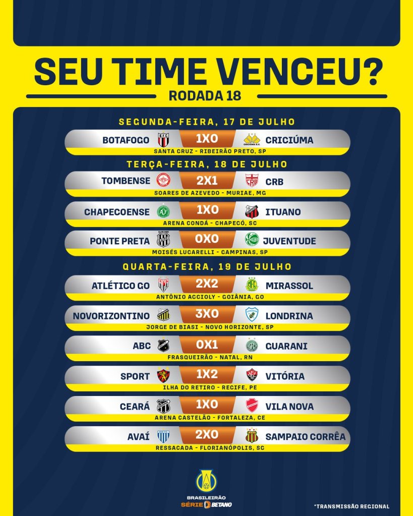 Já na parte de baixo da tabela, o Avaí, de Eduardo Barroca, ganhou depois de mais de 2 meses. O time catarinense fez 2×0 no Sampaio Corrêa e deixou a lanterna, que voltou a ser do ABC. A equipe potiguar perdeu em casa para o Guarani, por 1×0. Enquanto o Tombense bateu o CRB, por 2×1, e deixou o Z4.