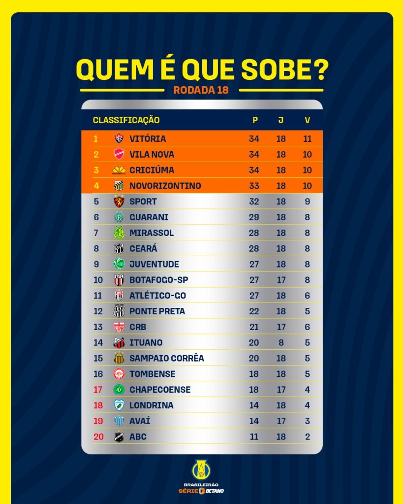A 18ª Rodada da Série B do Brasileiro foi encerrada nessa quarta-feira, 20, contou com mais surpresas e mudanças na parte de cima. O Vitória venceu o Sport, contou com tropeço dos concorrentes e assumiu a liderança. O Ceará além de ter ajudado os baianos, derrubou o então líder e subiu na classificação.
