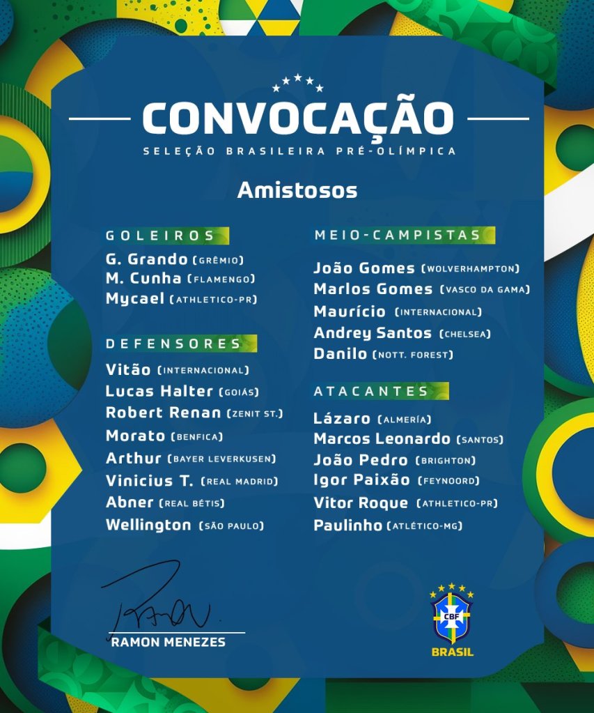 O técnico da Seleção Pré-Olímpica, Ramon Menezes, convocou, hoje, sexta-feira, 22 jogadores para a disputa de dois amistosos em setembro. As partidas serão contra a Seleção Sub-23 do Marrocos, ambos na cidade de Fes, no país africano. O primeiro, no dia 7. O outro, no dia 11. Confira abaixo a lista: