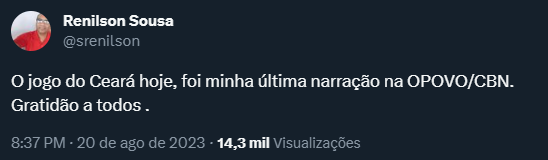 Por falar em comunicação esportiva, quem deixou a Rádio O Povo/CBN foi Renilson Sousa, outro grande nome da crônica cearense. O maranhense, que era um dos narradores da equipe de esportes da emissora, divulgou ontem em suas redes sociais a saída. “O jogo do Ceará hoje, foi minha última narração na OPOVO/CBN. Gratidão a todos”, escreveu. Renilson, contudo, segue todos os dias com o Trem Bala, na TVC, ao meio-dia.