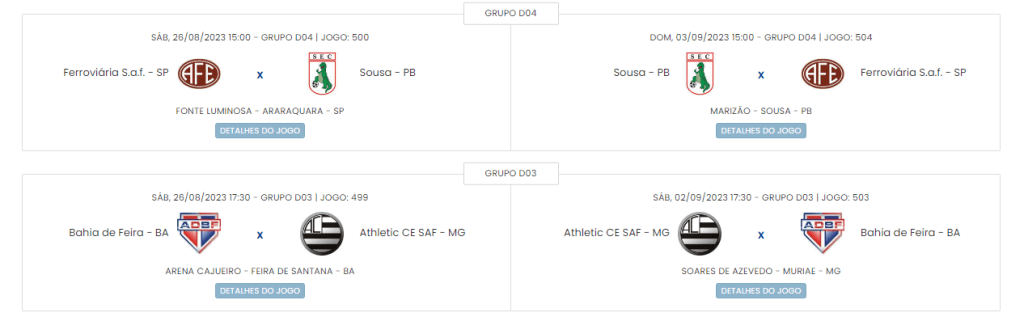 A CBF divulgou no final da tarde desta terça-feira, 22, a tabela detalhada dos confrontos das quartas de final da Série D do Brasileiro. O Ferroviário vai enfrentar o Maranhão e as 2 partidas terão transmissão da TVC (Canal 5.1).