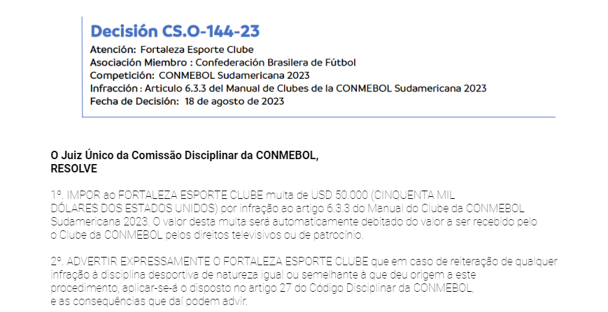 De acordo com a entidade esportiva, o Fortaleza utilizou o nome da competição mais a logomarca de empresas que não são patrocinadoras da Copa Sul-Americana. Confira o que diz o artigo em que o clube tricolor infringiu: