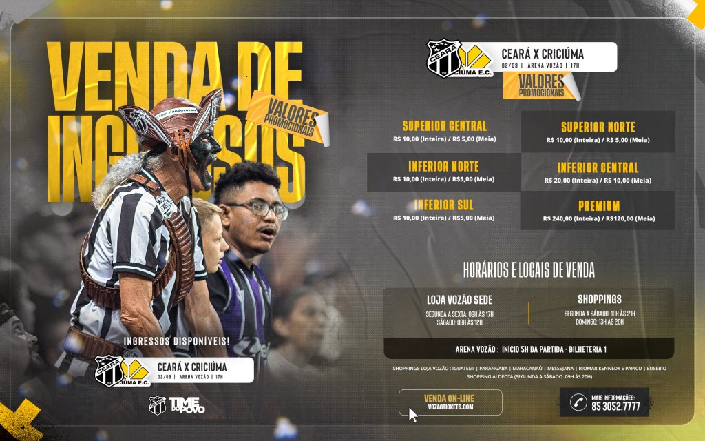 A diretoria do Ceará resolveu fazer uma grande promoção para contar com a presença do torcedor na partida contra o Criciúma, sábado que vem, às 17h, na Arena Castelão.