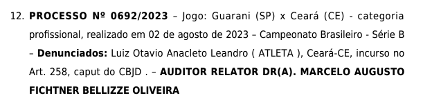 O zagueiro do Ceará, Luiz Otávio, será julgado na próxima terça-feira, 05, pela 2ª Comissão Disciplinar do Superior Tribunal de Justiça Desportiva. O atleta alvinegro está incurso no artigo 258 do CBJD devido à expulsão na partida contra o Guarani (0x0), realizada no último dia 02 de agosto, em Campinas, pela Série B do Brasileiro.