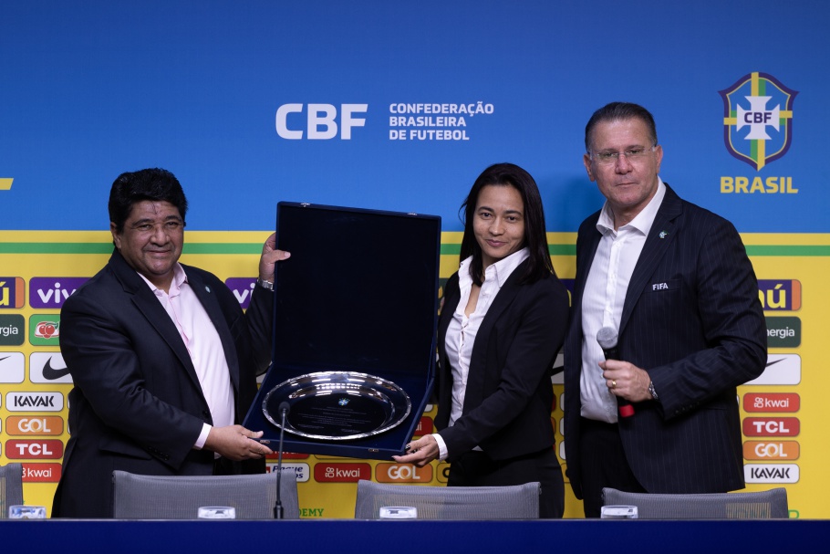 O quarteto de arbitragem brasileiro que atuou na Copa do Mundo Feminina foi homenageado pela CBF na última sexta-feira, 01, antes da convocação da Seleção Brasileira Feminina. O presidente Ednaldo Rodrigues entregou as honrarias à Edina Alves, Neuza Back e Daiane Muniz. Leila Cruz não pôde comparecer presencialmente, mas esteve ao vivo em videochamada.