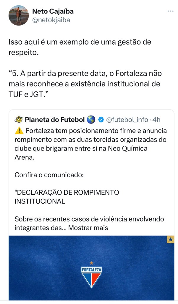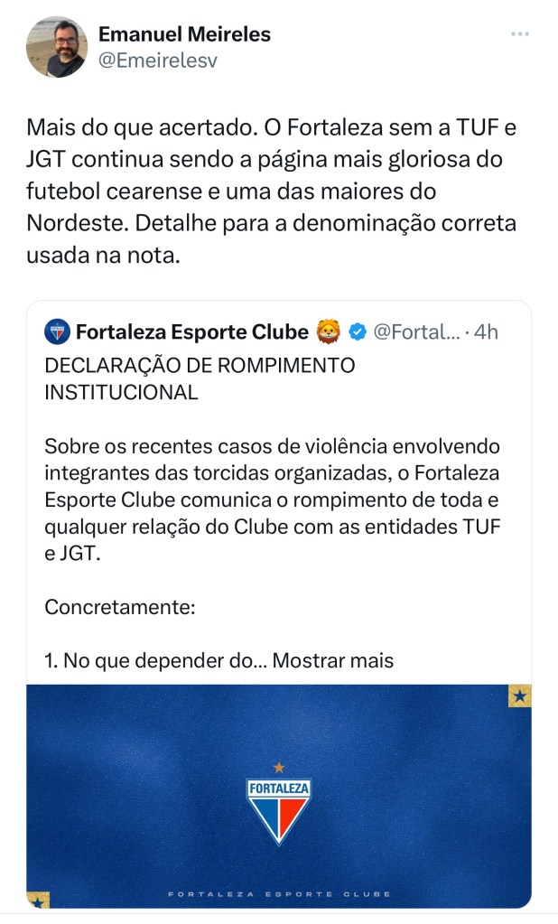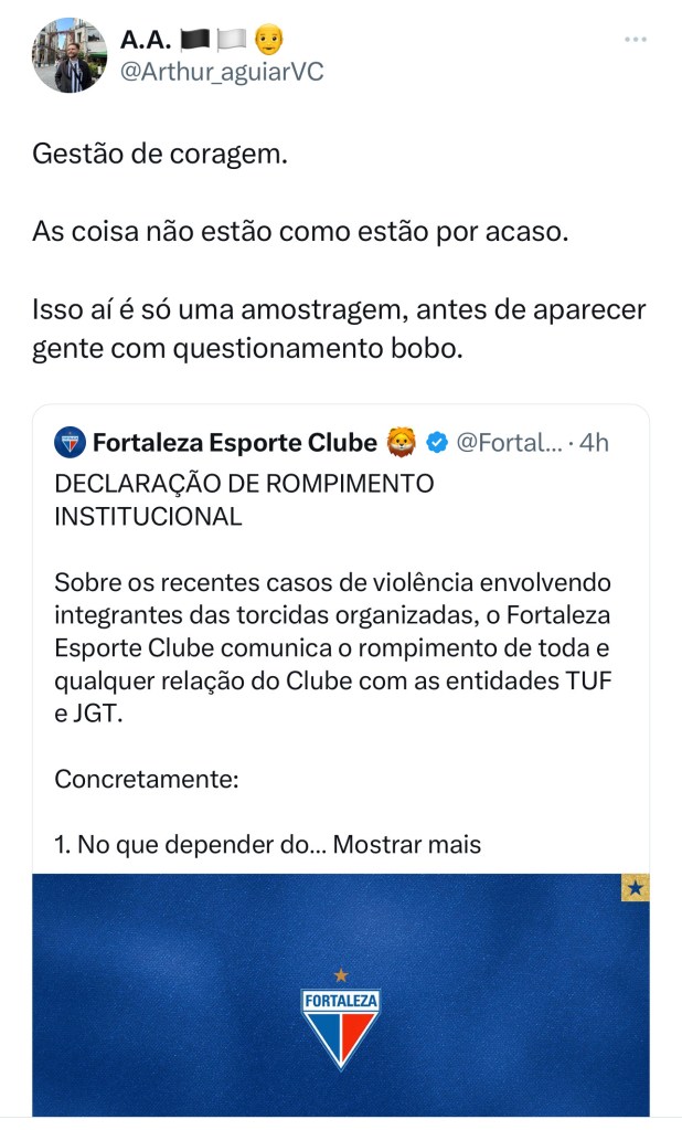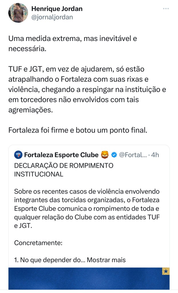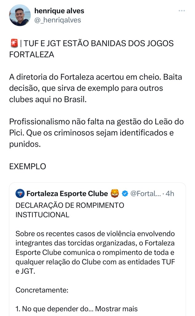 A decisão do Fortaleza de romper relações institucionais com as 2 principais torcidas organizadas (TUF e JGT) provocou uma onda de comentários positivos ao clube.