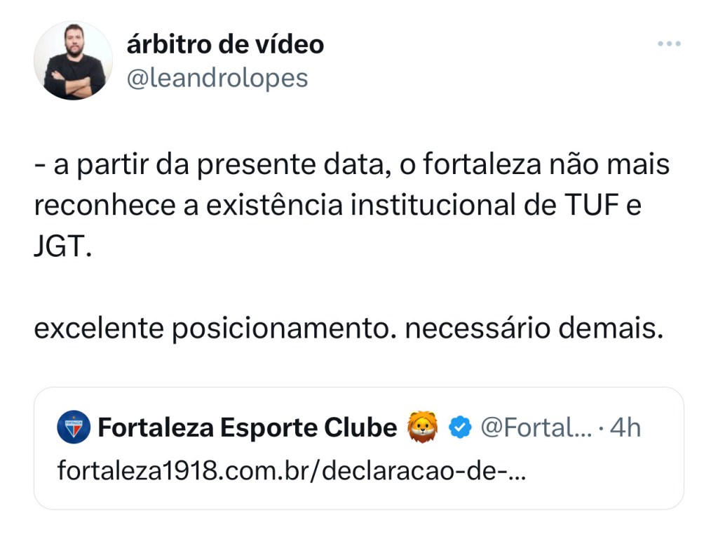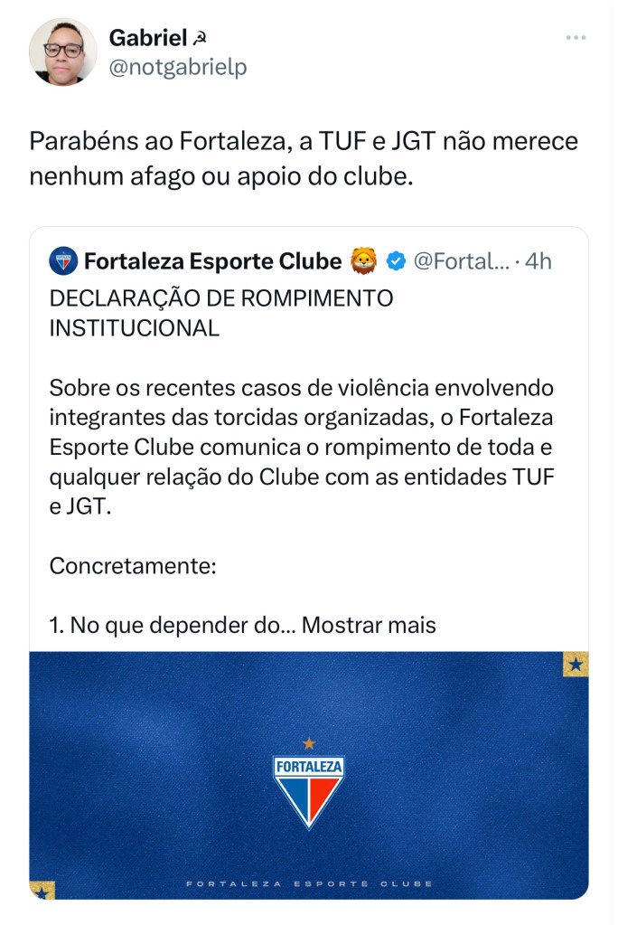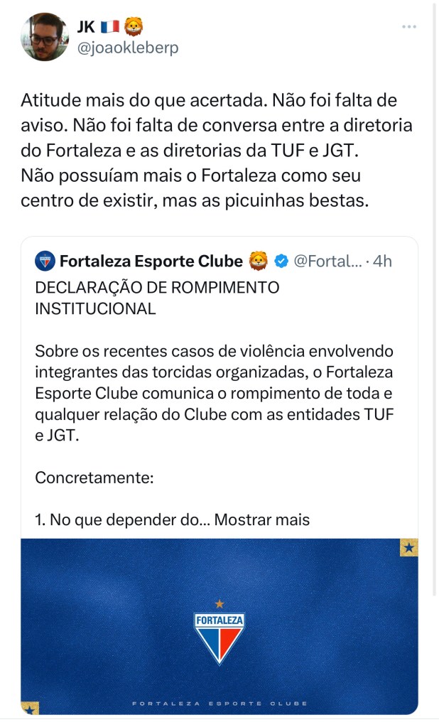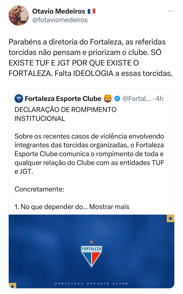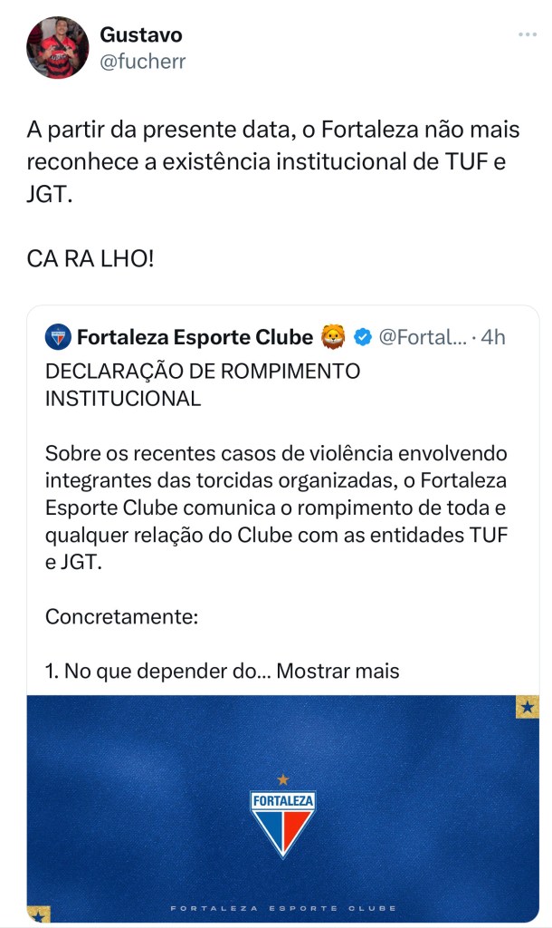 A decisão do Fortaleza de romper relações institucionais com as 2 principais torcidas organizadas (TUF e JGT) provocou uma onda de comentários positivos ao clube.