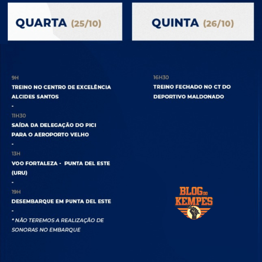No sábado, 28, às 17h, a grande Final contra a LDU, e já na madrugada de sábado para domingo, por volta das 2h, a delegação tricolor retorna a Fortaleza com previsão de chegada às 8h da manhã do domingo.