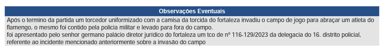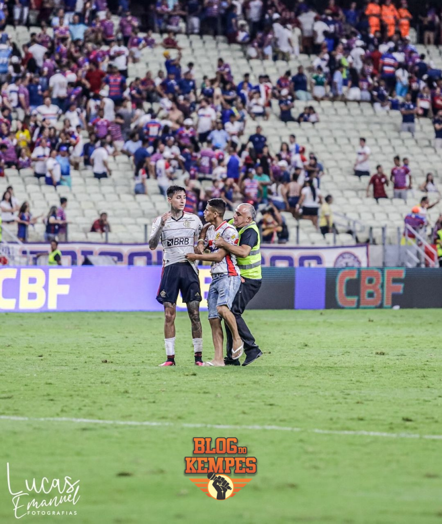 “Após o termino da partida um torcedor uniformizado com a camisa da torcida do fortaleza invadiu o campo de jogo para abraçar um atleta do flamengo, o mesmo foi contido pela policia militar e levado para fora do campo. foi apresentado pelo senhor germano palácio diretor jurídico do fortaleza um tco de nº 116-129/2023 da delegacia do 16. distrito policial, referente ao incidente mencionado anteriormente sobre a invasão do campo”, escreveu o juiz gaúcho.