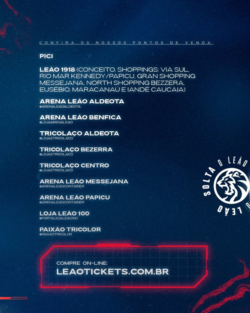 Diante do Cruzeiro, sábado que vem, às 18h30, na Arena Castelão, em jogo atrasado da 30ª rodada, os ingressos começam a ser vendidos nesta quarta-feira, 15, feriado, a partir das 9h, nas lojas oficiais do clube e também no site leaotickets.com.br.