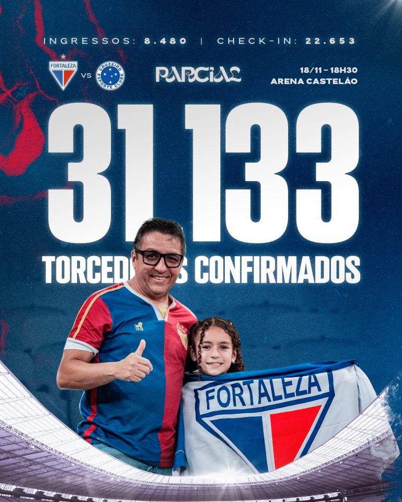 O Fortaleza informou nesta sexta-feira, que mais de 31 mil pessoas já garantiram um lugar na Arena Castelão para a partida contra o Cruzeiro, amanhã, sábado, às 18h30, pelo Brasileirão.