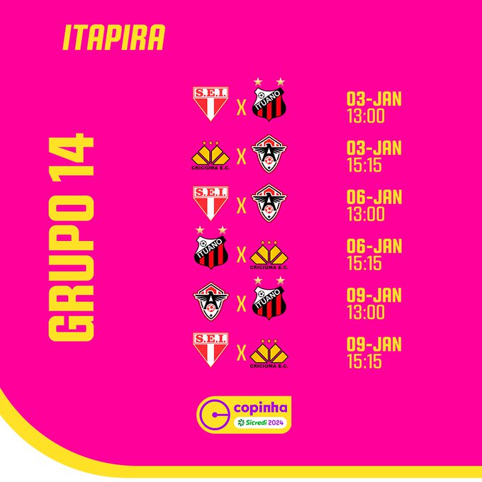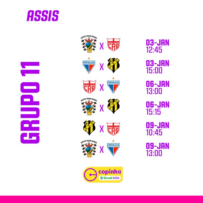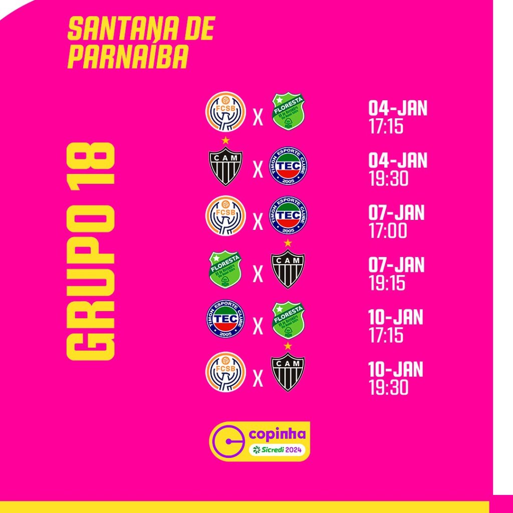 A Federação Paulista de Futebol divulgou a tabela detalhada da 1ª Fase da Copinha (Copa São Paulo de Futebol Júnior). 4 equipes cearenses estão no torneio, que começa em 2 de janeiro e a Final acontece no dia 25 do mesmo mês, Atlético, Ceará, Floresta e Fortaleza.