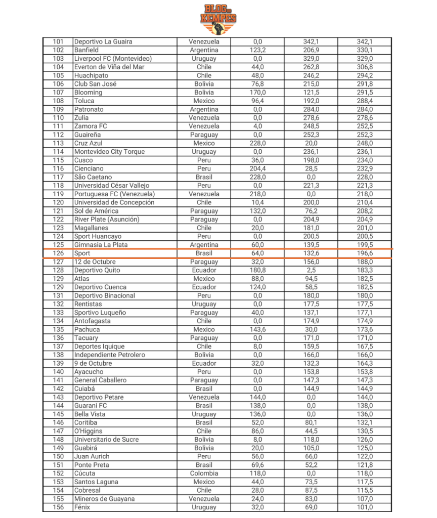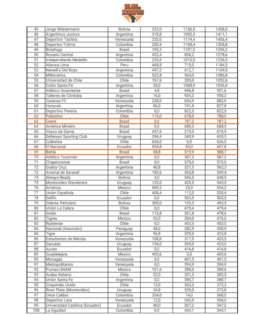 Em seguida, aparecem Bahia (69º), e Sport (126º). O Santa Cruz (199º), Vitória (229º) e Náutico (230º) completam o ranking dos clubes nordestinos. Apesar de não ser da Região, o Paysandu, do Norte, está em 188º.