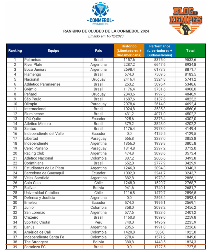 O Fortaleza é o clube nordestino melhor colocado. O tricolor está em 39º. O Ceará é o 2º melhor do Nordeste no ranking. O Alvinegro está em 63º lugar.