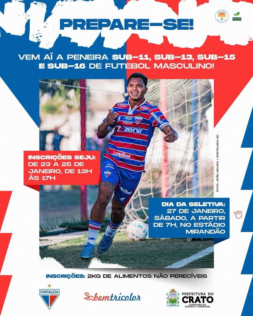 Já o clube tricolor vai fazer a peneirada no Estádio Mirandão, no Crato, a partir das 7h da manhã. Serão avaliados atletas para o Sub-11, Sub-13, Sub-15 e Sub-16. Para fazer a inscrição, a garotada precisa pagar 2kg de alimentos não perecíveis e será feita na Secretaria de Esporte e Juventude da Prefeitura do Crato, que serão doados para uma instituição na região do Cariri.