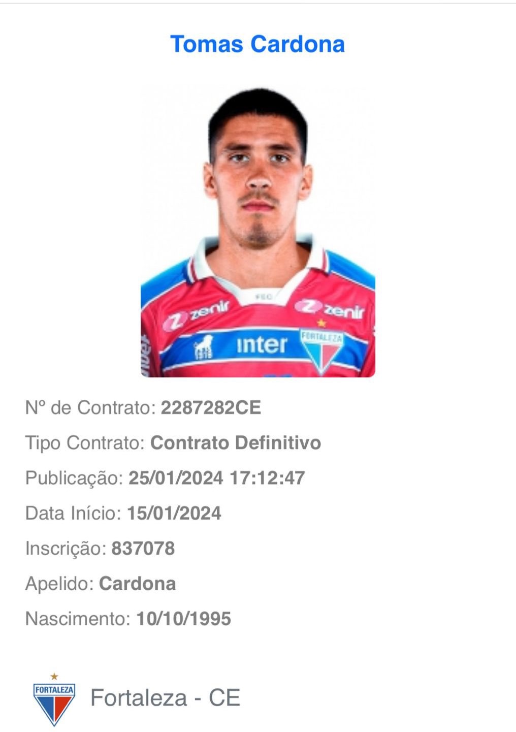 Último reforço anunciado do Fortaleza, o zagueiro Tomás Cardona foi registrado no BID da CBF. O defensor, caso o técnico Vojvoda queira, pode estrear no próximo domingo, quando o Fortaleza vai enfrentar o Barbalha, pelo Estadual, em Juazeiro do Norte.