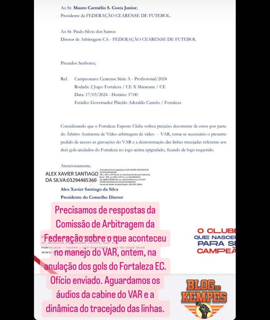 O Presidente do clube tricolor, Alex Santiago, foi incisivo na postagem em seu perfil no Instagram: “Precisamos de repostas da Comissão de Arbitragem da Federação sobre o que aconteceu no manejo do VAR, ontem, na anulação dos gols do Fortaleza EC. Ofício enviado. Aguardamos os áudios da cabine do VAR e a dinâmica do tracejado das linhas”, declarou o mandatário do Fortaleza.