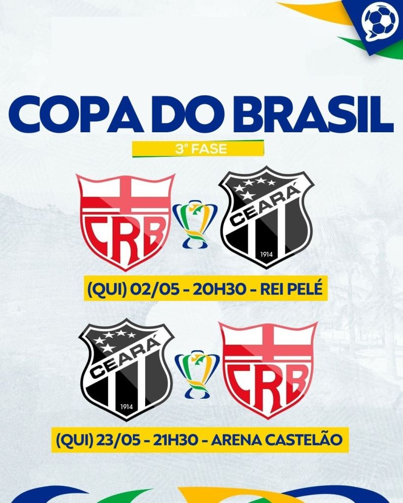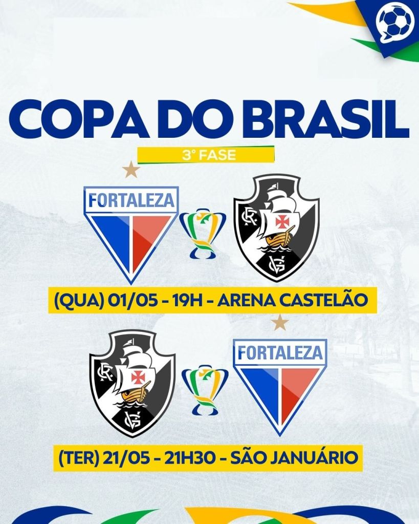 A CBF também divulgou ontem a tabela detalhada da 3ª Fase da Copa do Brasil. O Fortaleza vai enfrentar o Vasco, dia 1º de maio, quarta-feira, às 19h, na Arena Castelão, e a volta está agendada para dia 21 de maio, às 21h30, em São Januário. Enquanto o Ceará vai pegar o CRB, dia 2, quinta-feira, 20h30, no Rei Pelé, e a volta dia 23 de maio, 21h30, no Castelão. Os 4 confrontos serão transmitidos pelo Sportv e Premiere.