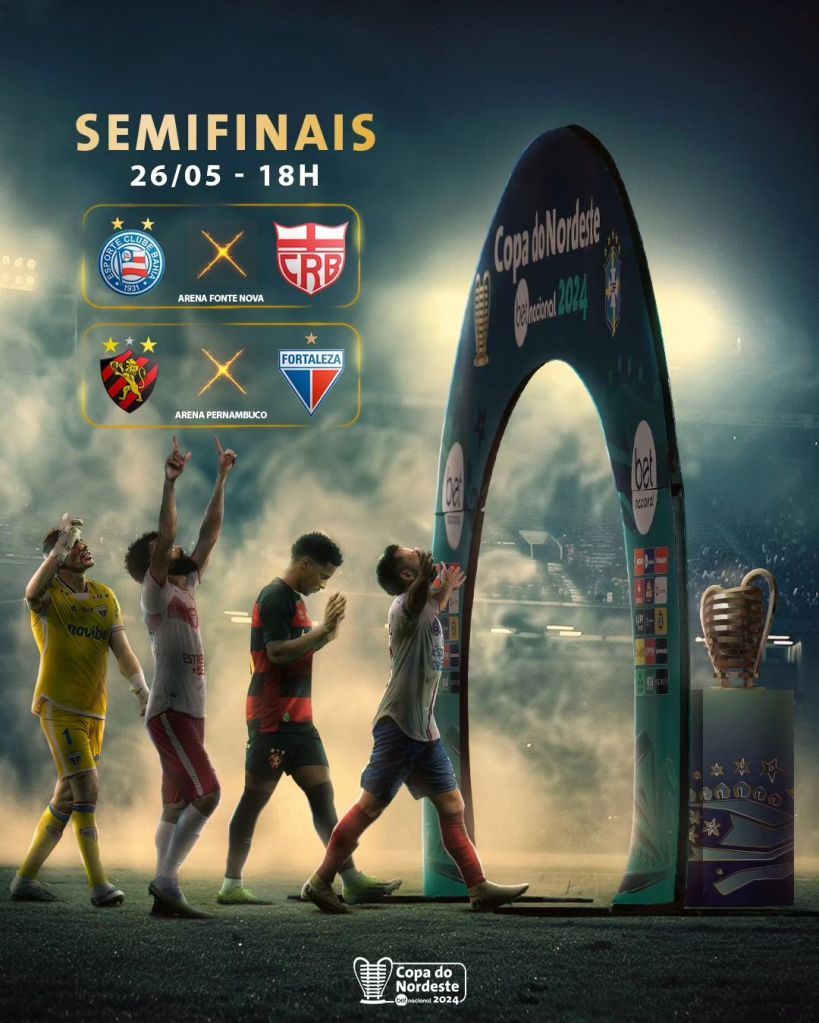 A CBF divulgou a tabela detalhada das semifinais da Copa do Nordeste. Os 2 jogos estão marcados para o dia 26 de maio, às 18h. Sport x Fortaleza vai ser realizado na Arena Pernambuco, enquanto Bahia x CRB vai acontecer na Fonte Nova. Enquanto o duelo em Salvador vai se transmitido pelo SBT (de lá) e Nosso Futebol, a partida em Recife terá a transmissão do SBT (Jangadeiro), ESPN, Star+ e Nosso Futebol.