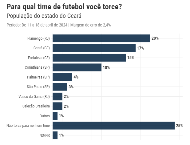 A do Ceará fica na 2ª posição com 17% e a do Fortaleza em 3º lugar com 15%. Enquanto a do Corinthians é a 4ª com 10%.