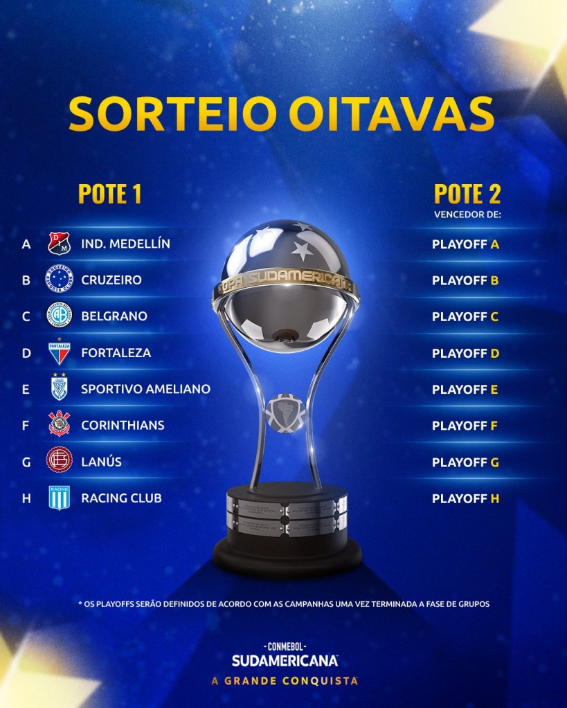 A Conmebol, contudo, vai realizar o sorteio para definir logo as partidas. Lembrando que os playoffs estão agendados para os dias 17 e 24 de julho. Aí com adversários definidos, as oitavas de final da Sul-Americana vão acontecer nas semanas dos dias 14 e 21 de agosto.