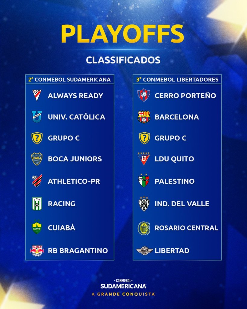 Devido à tragédia no Rio Grande do Sul, os jogos do Internacional pelo Grupo C foram adiados e serão realizados amanhã e sábado. Por isso, não foi definido o 2º da chave, que irá para os playoffs. Assim como o 3º colocado do Grupo C da Libertadores, onde está o Grêmio, pelo mesmo motivo e que irá jogar nas mesmas datas.
