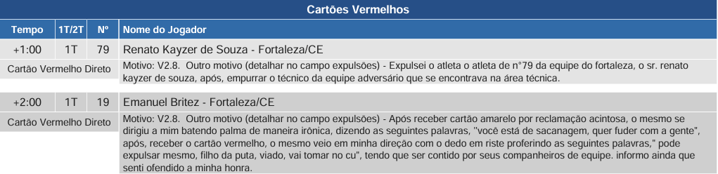 “Após receber cartão amarelo por reclamação acintosa, o mesmo se dirigiu a mim batendo palma de maneira irônica, dizendo as seguintes palavras: “você está de sacanagem, quer fud… com a gente”. Após receber o cartão vermelho, o mesmo veio em minha direção com o dedo em riste proferindo as seguintes palavras: “pode expulsar mesmo, filho da put…, veado, vai tomar no c…”, tendo que ser contido por seus companheiros de equipe. Informo ainda que senti ofendida a minha honra”, descreveu o juiz.
