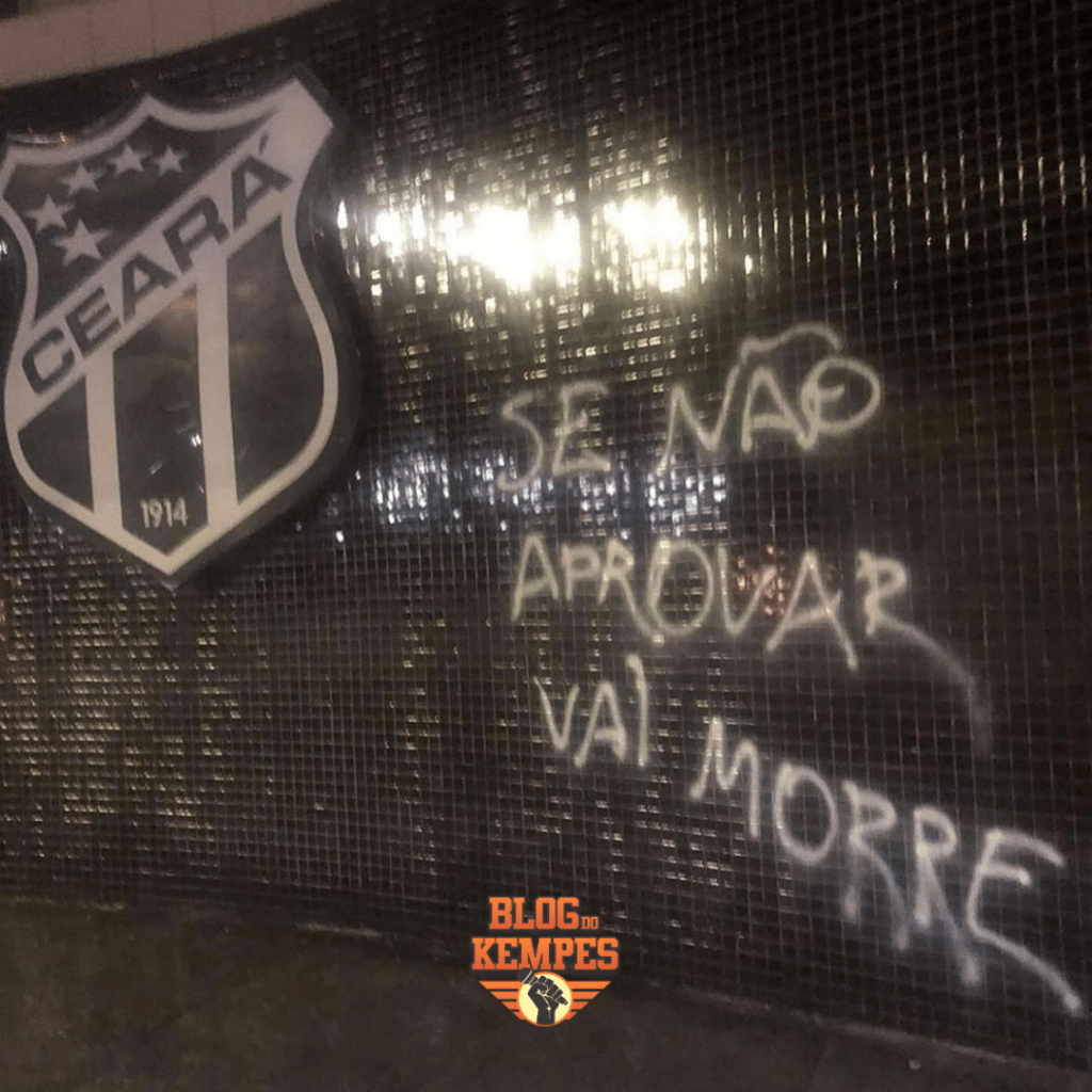A sede do Ceará apareceu pichada nesta segunda-feira, 17, dia da votação do Novo Estatuto do clube. Em tom de ameaças, as pichações têm o foco justamente na Assembleia Geral Extraordinária de logo mais a partir das 19h.