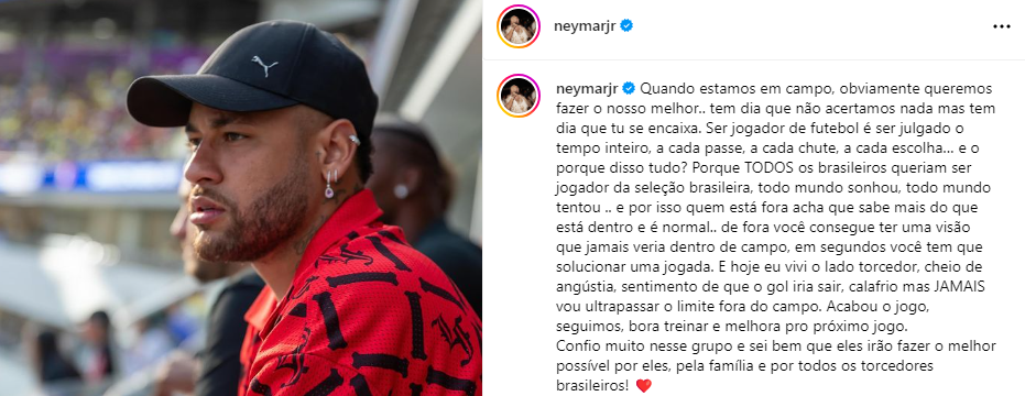 Por falar em Neymar, o jogador fez uma postagem em seu perfil no Instagram dando total apoio à Seleção Brasileira depois do 0x0 contra a Costa Rica.