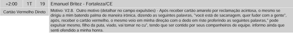 Já Brítez foi denunciado em 2 artigos: 258 II e 243F em ambos, a suspensão é de 1 a 6 jogos. O defensor soltou o verbo contra o árbitro, que escreveu tudo na súmula: