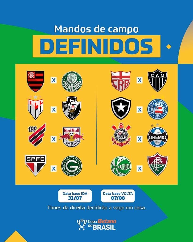 A CBF sorteou nesta quinta-feira, os jogos das Oitavas de Final da Copa do Brasil. O destaque ficou para o duelo entre Palmeiras x Flamengo. Os 2 times se enfrentam e somente 1 vai passar para as quartas. Ou grande confronto deverá ser Grêmio x Corinthians. As partidas estão marcadas para as semanas dos dias 31/07 e 07/08.