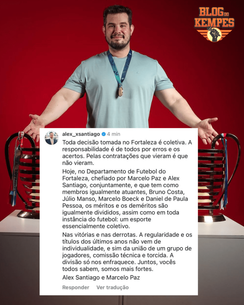 Depois de um entrevero no Departamento de Futebol do clube, que causou aflição e preocupação a todos os envolvidos, o Presidente do Fortaleza, Alex Santiago, e o CEO do Fortaleza, Marcelo Paz, divulgaram uma publicação em conjunto no perfil do Bora Leão, no Instagram, e selaram a serenidade e a calmaria que norteou o clube nos últimos anos.