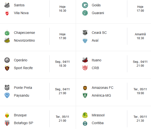 A 35ª Rodada da Série B começa neste sábado com 3 partidas, e o torcedor do Ceará precisa estar com o secador ligado. Na Vila Belmiro, às 16h30, o Santos recebe o Vila Nova. Um empate seria o melhor resultado. Enquanto às 17h, os outros 2 jogos. Em Chapecó, a Chapecoense recebe o Novorizontino. O time catarinense precisa ganhar dos paulistas. Enquanto Goiás e Guarani duelam na Serrinha. Veja abaixo a classificação da Série B e os jogos da rodada.