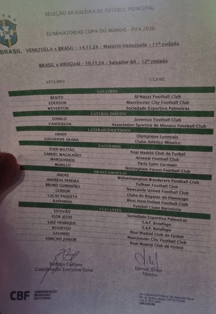 O treinador da Seleção Brasileira, Dorival Júnior, convocou 23 jogadores para os duelos contra a Venezuela dia 14 (em Maturín) e Uruguai dia 19 (em Salvador) pelas eliminatórias da Copa do Mundo. Dentre as novidades, apenas o zagueiro Murilo, do Nottingham Forest/ING, e Estevão, do Palmeiras. Enquanto a principal a ausência foi a de Endrick.