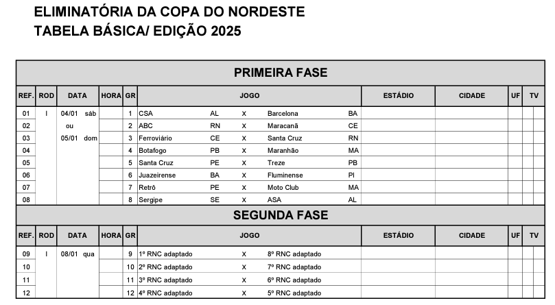 Vale lembrar ainda que a 1ª e 2ª Fases (eliminatórias) conhecidas também como Pré-Copa do Nordeste vão acontecer nos dias 5 e 8 de janeiro. O sorteio dos grupos ainda não teve a data definida.