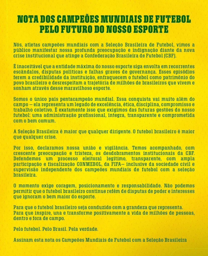 O que acontece na CBF é para desencorajar qualquer apaixonado pelo futebol brasileiro. Não foi à toa o manifesto dos ex-jogadores campeões do mundo nas redes sociais, pedindo uma reformulação urgente na entidade.