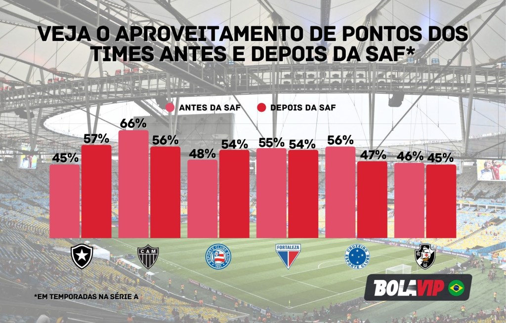 Das 6 SAFs comprovadas pelo levantamento – Botafogo, Vasco, Cruzeiro, Atlético-MG, Fortaleza e Bahia -, as de Botafogo e Bahia foram as que trouxeram maior ganho de desempenho até o momento.