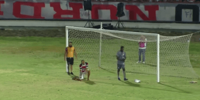 Torcedor do Santa Cruz invade o campo, ensina o goleiro do time como defender, é aplaudido pelo público e depois é levado pela Polícia